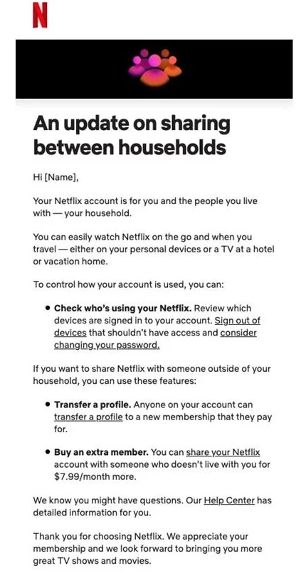 2023年5月末をもって、Netflixはパスワード共有の取り締まりを正式に開始しました。自宅IPアドレス以外のアカウントでストリーミング視聴するユーザーは、正式に月額7.99ドルを支払う必要があります。