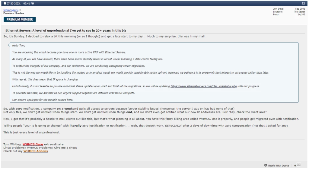 EthernetServers はスレッドで続けて、すべての顧客を「Equinix と Digital Realty の施設の組み合わせ」に手動で移行したと述べました。