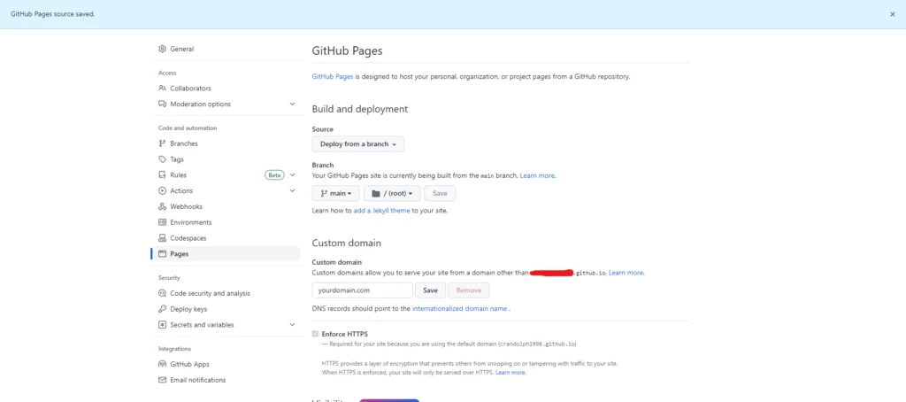 カスタム ドメインをボックスに入力し、そのカスタム ドメインが内部化されたドメイン (前述の .github.io ) を指すようにしてください。