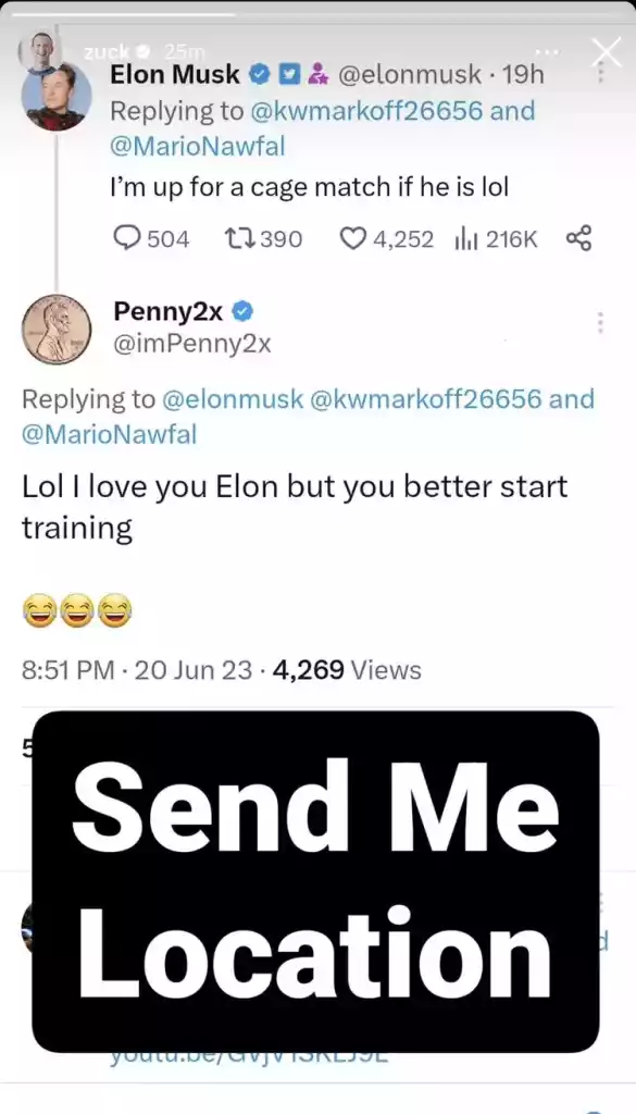 2023年6月下旬、イーロンはスレッドに関する投稿の中で、ザッカーバーグとのケージファイティングマッチについて言及した。