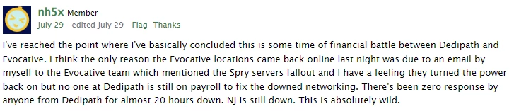 これは DediPath の単独のダウンタイムであったため、財務上の問題か、Evocative への未払い請求書に関する憶測が飛び交いました。