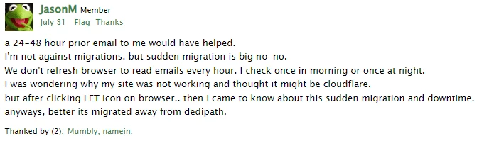 DediPath のダウンタイムに関する奇妙な事例について、DediPath チームからの返答がないまま、4,000 回以上閲覧されたスレッドが数日間存在しています。