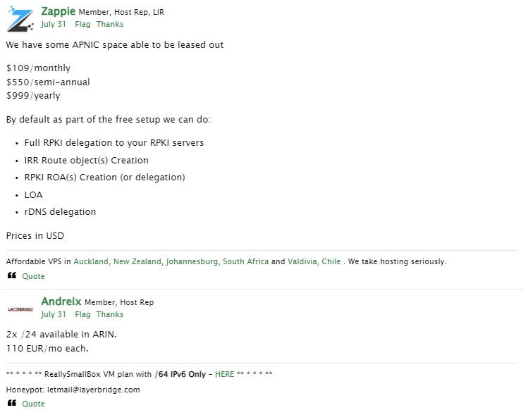 ホスティング関連のフォーラム 25230 には、 IP スペースの購入/レンタル専用のスレッドがあります。