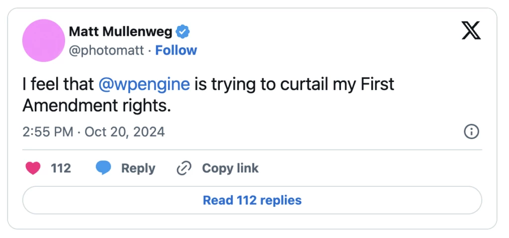 彼の主な不満は、WPEngineがオープンソースソフトウェア(WordPress)を完全に合法的に利用して収益を上げているにもかかわらず、マレンウェッグ氏がその分け前を受け取っていないという点だ。彼はこの件について、狂気じみた散文を数多く執筆し、ジャズの伴奏に合わせて朗読したこともあるが、根本的にWPEngineは違法行為や不正行為を行っていない。